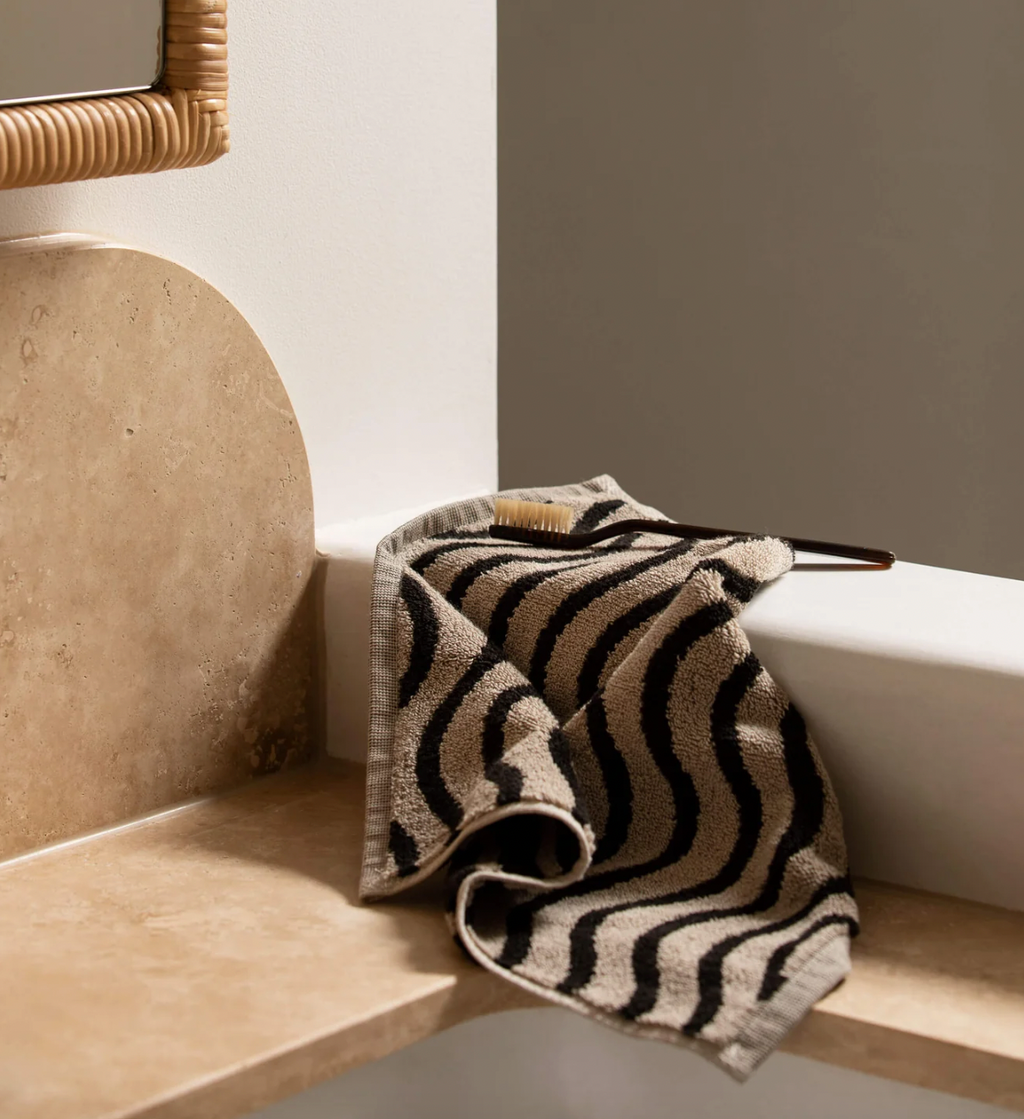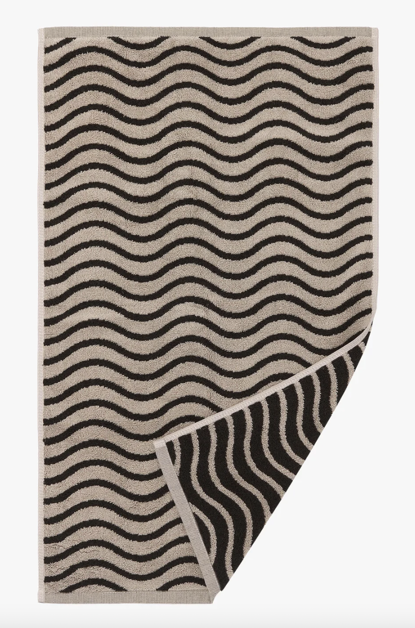 Made from ultra-soft and absorbent 650gsm cotton, this playful range features a reversible colourway. The soft Natural wave contrasting against Black makes a subtle statement in any bathroom, by the pool or at the beach.
